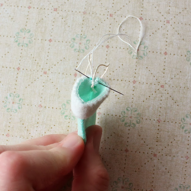 : Position knotted end of ornament loop onto the inside seam and sew in place, keeping your stitches small and neat and invisible from the right side of the ornament.
